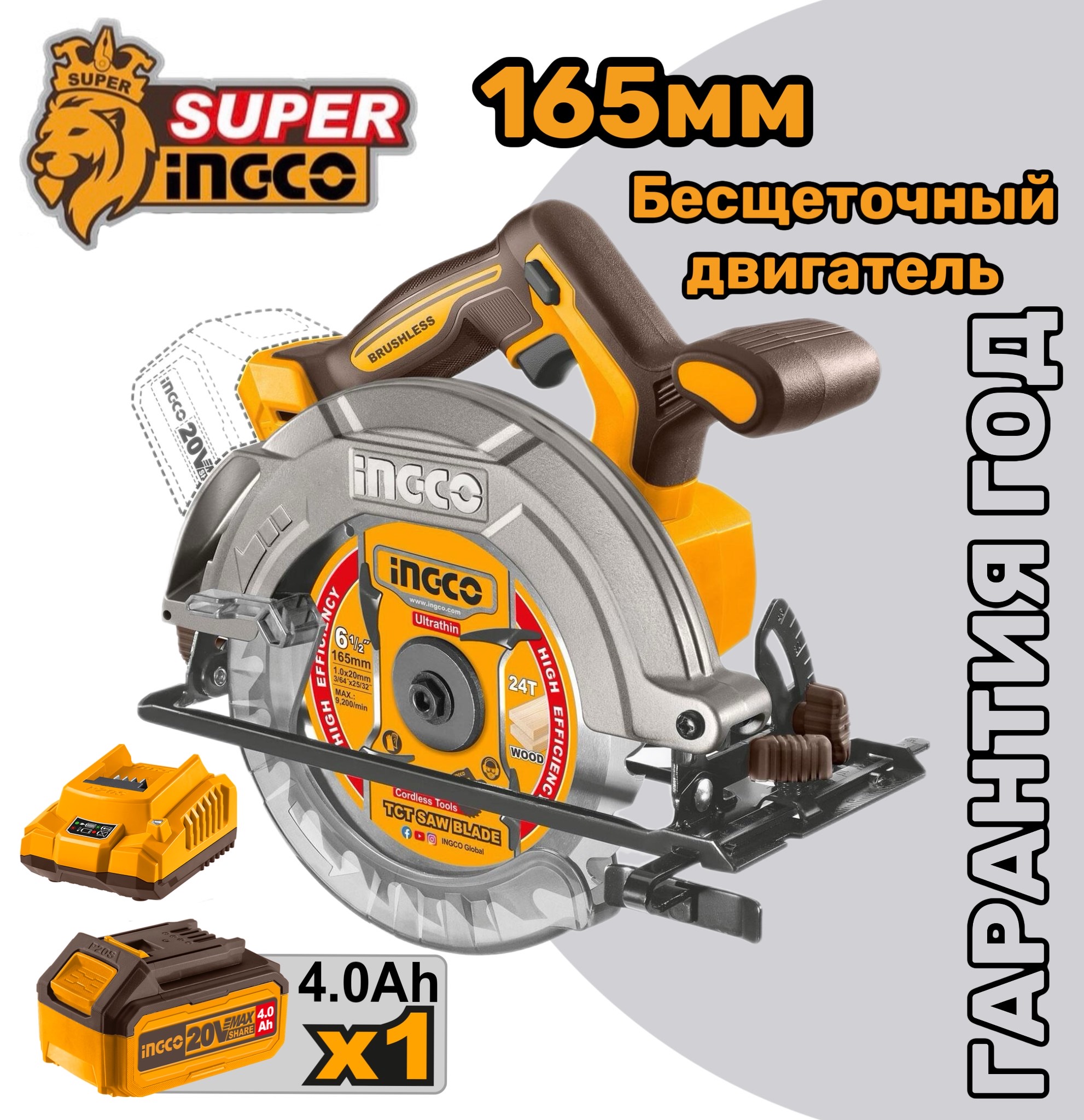 Пила циркулярная аккумуляторная безщеточная INGCO CSLI16521, 20В, Li-ion 4Ач, 165мм