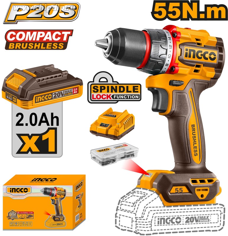 Дрель-шуруповерт аккумуляторная бесщеточная INGCO CDLI205582, 20В, Li-ion 1x2Ач