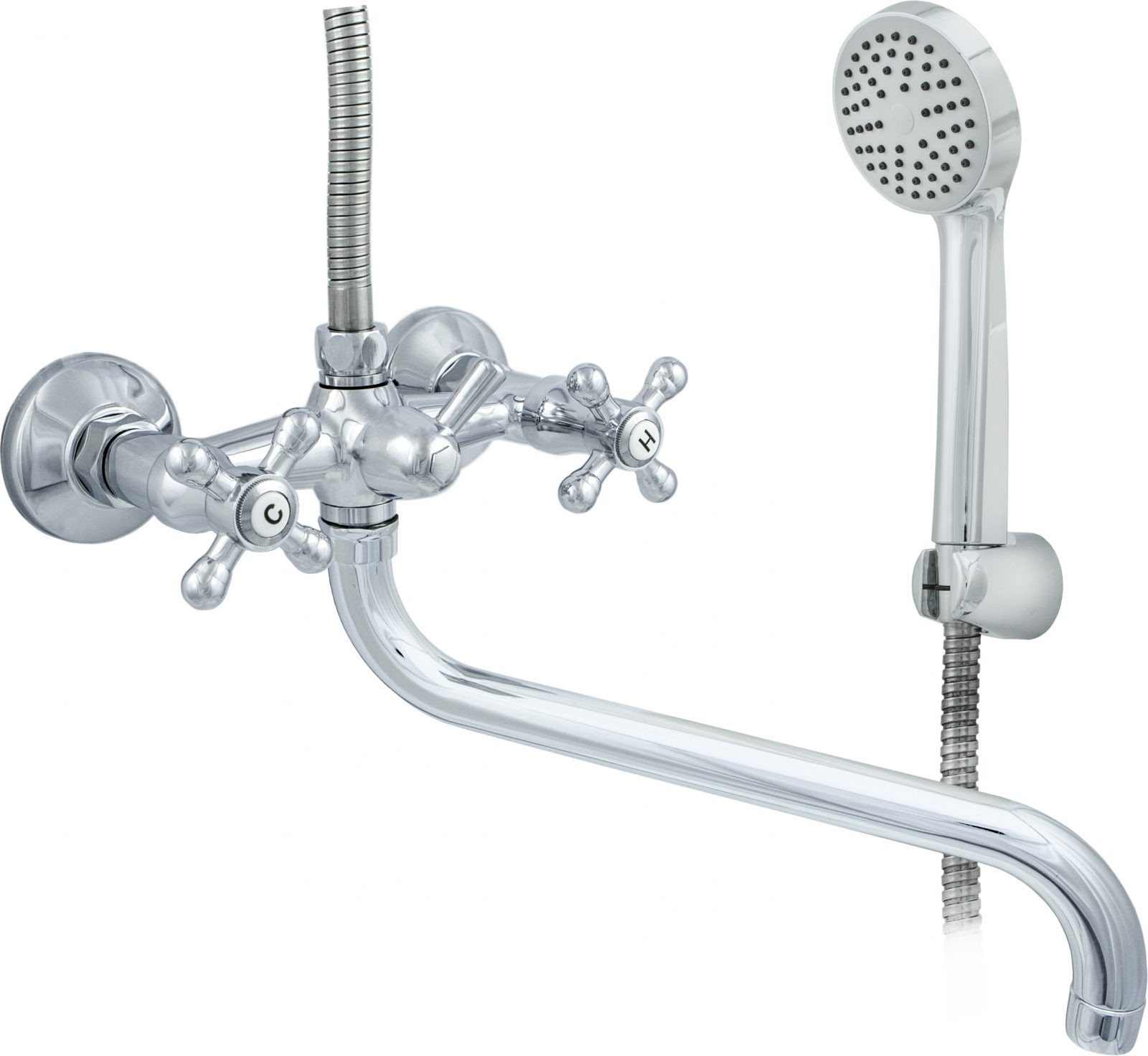 Смеситель для ванны КРЕСТ ЦС-СМ 600/5.1-4 двухвентильный длинны излив с лейкой и шлангом цвет хром