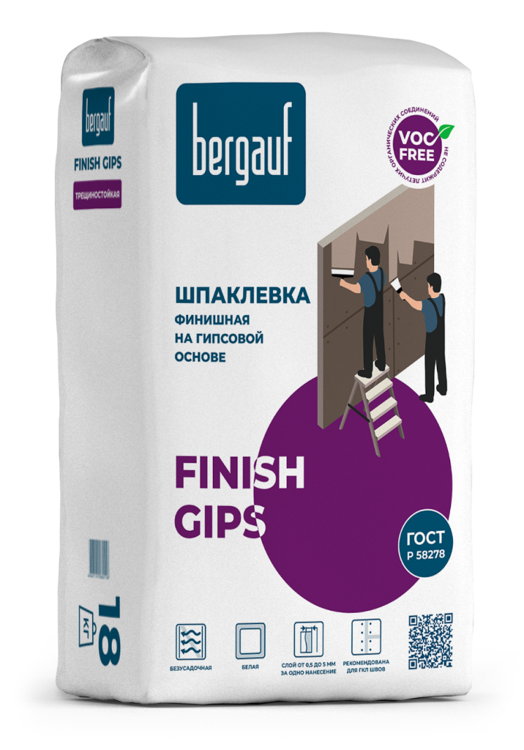 - Гипсовую шпаклёвку Bergauf Finish Gips создана для заделывания стыков между гипсокартонными листами, финишного шпаклевания, ликвидации незначительных дефектов на бетонных поверхностях и гипсовых, цементных и известковых штукатурках внутри помещений. Вяжущий материал - гипс. Кроме него в состав шпатлевки входят, полимерные модифицирующие добавки и минеральные наполнители.