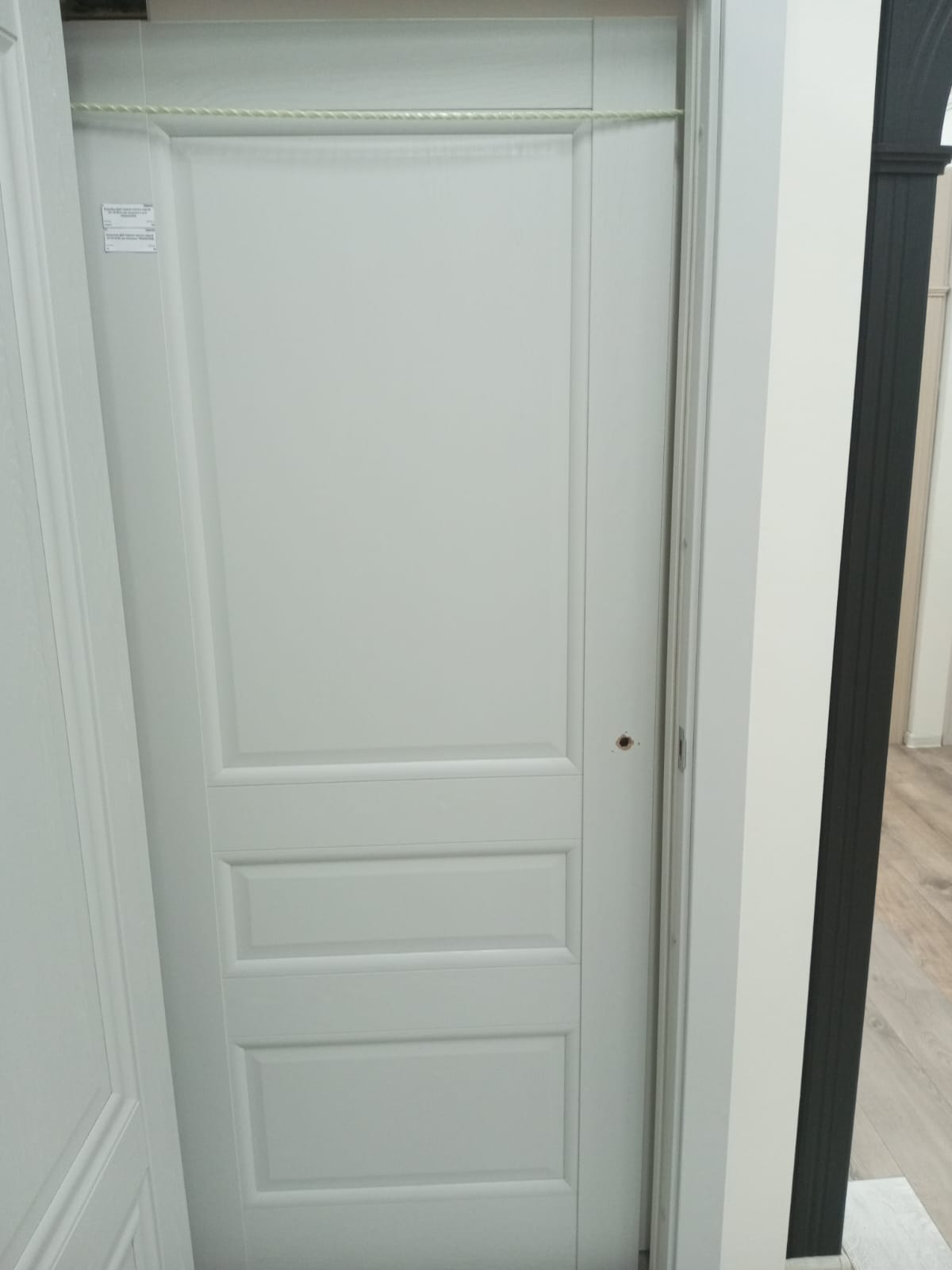 Витринный образец. В двери есть врезка под ручку и межкомнатную защелку. И отверстия от петель бабочек.