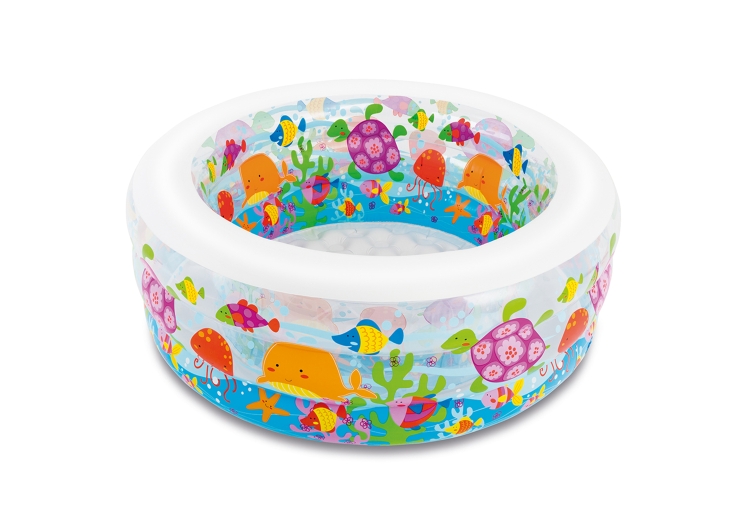 Бассейн диметром 1,5 м представляет собой просторную емкость для 2 и даже 3 малышей дошкольного возраста. Прозрачные виниловые стенки состоят из 3 секций. Верхняя часть борта оформлена контрастной белой полосой. Одно из преимуществ — мягкое надувное дно. Оно обеспечивает только комфортные ощущения коленям и пяточкам ребятишек.