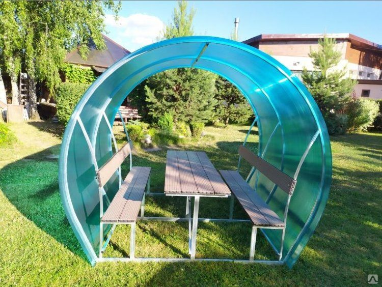 В комплект входит вся необходимая фурнитура. Вместительность беседки — до 8 человек.