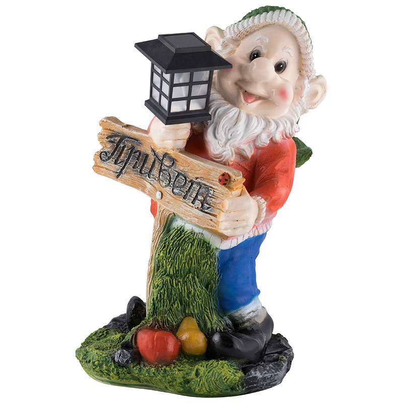 Гном "Привет" с фонарем, фигура декоративная-садовое освещение, H-60см., скидка 20%
