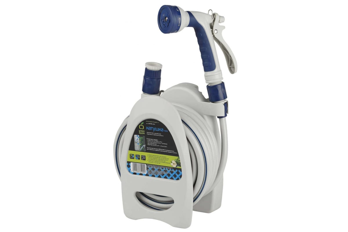 Компактная катушка GREEN APPLE предназначена для переноса и удобного размещения садового шланга. В комплектацию входит садовый шланг, 7-режимный пистолет-распылитель и набор для подключения.