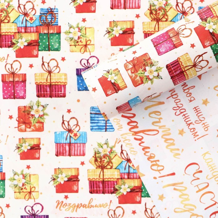 Бумага упаковочная глянцевая двухсторонняя «Подарки», 70 ? 100 см