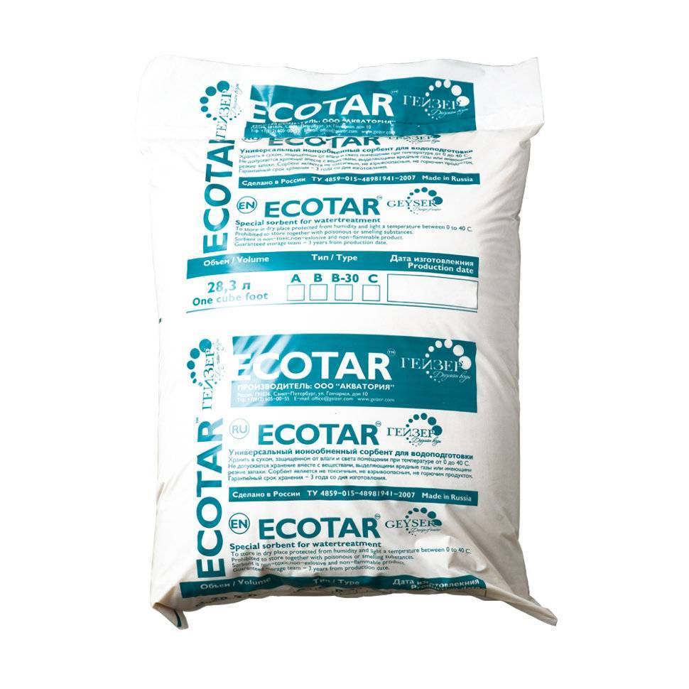 Экотар В - многоцелевая комбинированная ионообменная загрузка, применяющаяся в качестве наполнителя в засыпных станциях фильтрации воды от растворённого железа, марганца и солей карбонатной жесткости. Экотар B представляет собой комплекс из нескольких различных катиона-обменных, аниона-обменных и сорбционных материалов (смол), фильтрующие свойства и особенности каждого из которых, позволяют фильтру обеспечить единовременное обезжелезивание, деманганацию и умягчение воды. При этом, количественное соотношение каждой смолы в наполнителе, объясняется её функциональной направленностью и способностью к поглощению того или иного загрязнения. В данном случае, загрузка Экотар B , ориентирован на удаление высокого содержания растворённого железа и марганца, предполагая тем самым, в большей степени, очистку воды из глубоких и артезианских скважин.